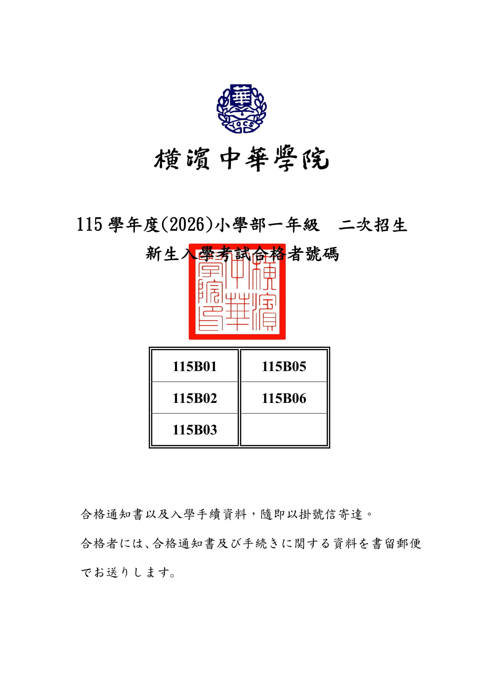【2026-01-21】 115學年度 (2026) 小一新生入學考試二招合格者號碼
